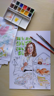 Tante cose ci legano e solo la distanza ci ha tenuto separate. Il sorriso di Franca rappresenta il suo carattere: luminoso, alla ricerca della felicità ed estroverso. E così, con il calice alzato, mi è piaciuto ritrarla. Ho sempre notato in lei questa grazia un po' "old style" 😊 e la golosità da cui è circondata esprime bene la sua gioia di vivere, con un po' di humor che la rende leggera. La definizione che amava dare di sé era "The Crazy Girl", perché aveva sempre un eccesso di entusiasmo, la battuta veloce, l'attrazione per le bizzarie. Ora, è una donna e non so quanto di quella pazzia sia rimasta in lei, ma questo suo ritratto ad acquarello, spero abbia messo in evidenza quel lato very British ma insieme amichevole.